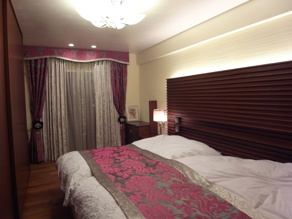 寝室の光漏れ防止のため、「レースカーテン」、「無地のドレープカーテン」、「柄のドレープカーテン」の3重のカーテンスタイルとしてコーディネートいたしました。