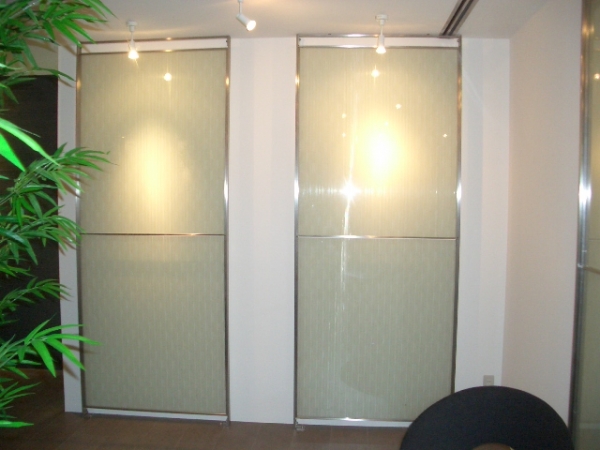 ガラスとガラスの間に生地を挟み、パネルカーテンを製作しました。