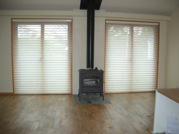 【ハンターダグラス】 上窓:ジュエットシェード。 下窓:シルエットシェード。